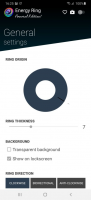 After installing the program, you can go to the settings to change the appearance of the ring. It is possible to choose the thickness of the ring and color. It also supports the mode of changing the brightness depending on the current charge level. A separate option allows you to activate animation when external power is connected. When the charge decreases, the ring will turn into an arc. It is possible to change the direction.Compatibility