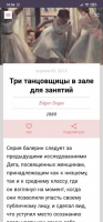 The program provides an extensive database with a variety of pictures. At the same time, new information appears in the utility on a daily basis. Text posts can be divided into several topics. Among them are: museums, biographies of prominent artists, histories of the writing of various paintings and much more. With the help of the utility, a person is able to find out detailed information about many paintings. Among other things, the free application provides information about the place of storage of the object of art, the time of writing, a photo and so on. If desired, the user can share the favorite object with other people. To do this, the application has an option to send a publication about the painting to messengers and social networks, including Viber and Twitter.Features