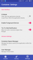 After the installation of the application, you need to select ARC files for further virtualization. They should be added to the list of installed utilities. For each copy, its own container is formed. Its icon is not visible on the desktop and in the main menu. To switch to a running copy, you should open the Cointainer utility and select a specific application of interest from the list that appears. Virtualization allows you to easily pass authorization in the social network VK from several accounts and then perform a quick switch between them. Each of the copies is completely isolated from the others. Therefore, when switching between separate accounts, there is no need to re-enter the password and login each time.Cointainer settings