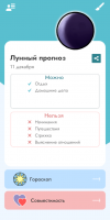 The application has an intuitive menu with comfortable navigation and structured sections. To start using it, you need to enter the day of your birth. In this way, the program will determine your zodiac sign and will be able to issue the corresponding forecasts every day. The category that includes the solar horoscope is categorized on several pages. And the lunar horoscope, in turn, is made, depending on the actual phase and includes recommendations regarding what you can do on this day and what you can not. One more section is responsible for compatibility. To get it, you need to enter your date of birth and your other half. Due to this you can determine how compatible people are with each other.Additional features