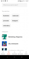 The start page of the mobile utility displays the most popular courses. Also, a person can search for the classes he needs through the search bar. The online service has a huge number of courses of various topics. These include:- Fashion Design;