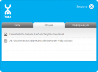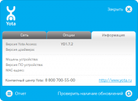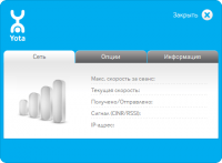 The Yota Access program is created in a simple graphical shell and has a pleasant interface. The main window of the program contains three directories: "Network", "Options" and "Information". The first window contains all the data that shows the connection speed, the maximum speed for the whole time in the network (after going online) and the total figures of the given and downloaded megabytes. The "Network" section displays data on the current operation of the device and shows the full statistics of the modem's operation in the network. You can view detailed information about the connection quality and IP-address of Yota - device. In the following sections there are "Options", which provide the program icon customization, notification panel and the number of updates in automatic mode. The "Info" menu displays the version of Yota Access, its firmware, model and MAC address . In addition to the main panel, you can use an additional panel that is located on the taskbar of the operating system. This panel shows internet connection errors, and all sorts of network problems.Operation