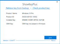 ShowKeyPlus provides access to necessary information without unnecessary operating system settings. The utility shows the key to the program and the version of the working Windows OS. The program is user-friendly and does not require any special skills. You can view the license key of another Windows OS if you have more than one operating system installed on your computer. The utility has a function that shows the license key of a non running Windows OS. ShowKeyPlus quickly "pulls" the key, and displays the data on the monitor screen. The utility extracts license keys from system backups.Features