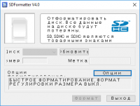 The program works in portable mode. Run it and format the SD card. SDFormatter solves problems with unreadable or unwritable information. If normal formatting does not restore the SD card, then use this utility. The program helps to clear the drive of unnecessary and unreadable data when standard Windows OS tools fail.Features