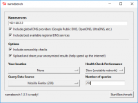 After activating namebench, you will immediately see the working window of the program. The parameters set by the developers are universal for most users and can be left unchanged. To start the search, press the start button and the software will start scanning. In some cases, the procedure can last up to an hour. Everything is performed on an automatic level. If the program finds the fastest connection protocol, record the detected result. Write it in the network connection settings and your speed will be higher than before.Features