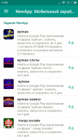 The graphical shell of the application is qualitatively localized for Russian-speaking users, so you will have no problems with its use. Any user, even those quite distant from digital technologies, will be able to get to grips with the functionality. All the options are in their places, so you can understand intuitively. Using NewApp you will definitely not become a millionaire, also it will not be able to replace your full-fledged job. But as an additional income - it is definitely the way to go. Since you will be able to pay for communication, internet and many other functions, and still have money left over. To earn, you just need to download and install the client on your device, and then track and take interesting tasks. The whole point of the tasks is to download the game, as well as spending a certain amount of time in it. Download programs should be from the official market, so you can not be afraid that they have any viruses. In general, the work is very simple and does not require from you special skills and monetary investment. Every day you will be provided with a set of utilities that you must download to get paid. Payment comes immediately upon completion of the installation. There are no limits and restrictions, do as many tasks as you think necessary.Key Features