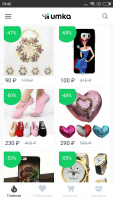 Umka Mall application has a very simple and minimalistic interface. Any user will be able to understand it. At the bottom is the main navigation inside the program. There are only 4 buttons on the navigation bar, which allow you to go to the cart, main page, catalog of favorite products and your profile. But to access the main catalog, you will need to click on a special button, which is located in the upper left corner. There is also a button to access the sale. As you can see, the interface of the program is not overloaded with unnecessary buttons.Directory
