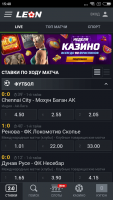 "Leonbets" in terms of functionality does not differ from many bookmaker's offices. You bet on different sports before the match or during the fight. Making a bet online, that is, during the game, the application offers odds in an interesting ratio. Choose a suitable variant of the match outcome and make a bet with the bookmaker on different terms. In soccer, you can bet on the victory of the team by selecting a suitable mode of the outcome of the match, and specifying the number of goals, as well as other features of the game. In addition to soccer, at Leonbets you can bet on tennis, hockey, basketball, volleyball and other sports. If necessary, you can bet on "cybersports" - online fights of gamers. Enter the "Search" section or use the "Top Matches" section, which contains popular bouts and competitions, to find the events you need. The application is equipped with a section with online games with real money withdrawal.Using the application