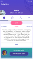 Launching the application "Astral Coach" for the first time, you will need to enter your birthday and authenticate with Facebook in order for the program itself to search for the necessary data. Then you will see the main screen, which will display today's horoscope, written for your zodiac sign. By "swiping" left and right, you can switch between days. Unfortunately, in Astral Coach, tomorrow's forecast only appears in the evening. However, users can read horoscopes published a few days ago.Additional functionality