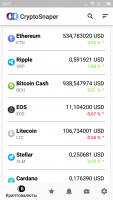 Crypto Snaper is a mobile client for portable Android devices, thanks to which you can always be aware of the current exchange rate of cryptocurrencies traded on major exchanges. The application provides information and market value and general metrics of tokens online and allows users to create their own list of "Favorite" currencies. The app makes it quick and easy to track bitcoin to dollar or to other cryptocurrencies.