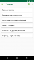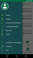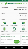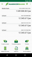 A good difference of Hamkor Mobile program for Android phones is the ability to view the balance of all user accounts in any monetary equivalent. In the situation of attaching a bank card you can see the limit and time of future payment. At a preliminary request you can see the whole history of actions with detailed characterization of transfers, size and time of debiting, recipient of the transfer.Payments