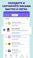When preparing e-mails for sending, the program personally recommends e-mail addresses. You can categorize messages by different types and use the search bar to instantly find the desired sender. It is possible to correct the arrival of messages only from people by removing companies and newsletters from the list. To save space on the phone there is a distribution of all messages in a non-paid storage-cloud, which has a size of up to a thousand GB. There is a pairing with Google Disk and Dropbox services for open access and comfortable moving of materials from the storage. In the parameters of the program there is an opportunity to set the time that will be set to cancel the sending of the message.Features