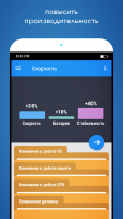 Plugin provides an opportunity to adjust the clock speed of the processor and the amount of RAM used to increase the performance of the phone. The choice of settings is made automatically. To increase the speed of functioning will still turn off all utilities that work in the background format. Moreover, the program deletes cache and destroys temporary data, which gives you the opportunity to clear space on the internal storage of the phone.Power saving