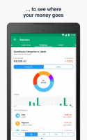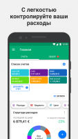 Wallet is a program for controlling and creating money plans on Android phones. The program gives the opportunity to monitor spending and manage the status of the client's accounts. Customers have the ability to attach personal bank details, after which the program will be able to independently see account transfers and show this information in the statistics. The creator of the program says that the analysis of information is carried out quite safely, and the program works with more than four thousand banks. The program has a fairly simple and functional interface design. In the main menu, the client can change the widgets to show, for example, to make a list of accounts and performed actions. Using the floating key, it is possible to enter all money movements. When adding new expenses, the client selects the account from which the amount of money has left and also recognizes the type. Because of the division of expenses by type, the program makes very effective charts with colored indicators. You only need to look at such a report to see which spending items are taking more money. In addition to showing data on the client's money, the program allows you to create reports and download them to your phones. The program also contains unique sections with additional options: it is possible to enter information on budgets and debts, assign goals and discount cards, create lists of purchases or share budget plans with other clients.