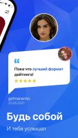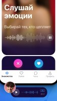 The program works like the Tinder service, but instead of a picture you can determine the presence of sympathy by voice message. There are search parameters for dating in the program. There is the ability to enter the age range, the purpose of conversation and gender. The program shows audio business cards of people, which can be flipped left and right, if the vox likes or not. There is an ability to select the quickness of listening when playing messages. Access to the chat room is given when likes match. There is an option to send voice messages. In the program there is an option "Quick Dating". It organizes the selection of a partner by search parameters and auto start a conversation for one minute. When mutual feelings appear, you can start a conversation in a normal chat.Features