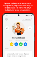 First of all, customers need to select one of the types: I am a customer or I am a professional. Customers only need to enter their locality and start working with the program. Professionals in addition need to write the number of their cellular device. In the main menu of the program customers can read a welcome message from the chief director of the organization, and also a small list of the most famous categories with profiles of masters. There is an opportunity to find helpers for household, repair, interior decoration, moving, delivery, construction and so on. For comfort inside all sections there is a search line, where you can enter the name of the specialist or work. In the program parameters, clients can create an account, contact the support team, complain about something or someone or send a proposal for improving the quality of the platform.Applications