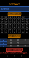 At the initial stage the utility asks you to specify the buffer size, after entering the data the button that starts the path calculation is automatically unlocked. Next, you need to use the camera to scan the matrix with a set of symbols, which is displayed in the game interface. It is worth considering that for this option the application needs to allow access to the camera. In response, the utility will return a copy of the original matrix, but some of the symbols will be highlighted in green color. It is these symbols that are the correct solution - a set of numbers will also appear at the bottom of the screen, indicating the correct input sequence. In most cases, the mini game allows several solutions, but the most optimal sequence brings a higher reward.Features