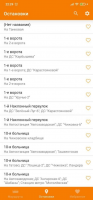 Access to the timetable is realized in the form of three tabs: trolleybuses, buses and streetcars. The schedule is displayed as a table or a list. You can view information about an individual route - the arrival time, list of all stops, route number and other information are displayed. It is possible to set up notifications - the program will warn you about the approach of the desired transport. You can make a cut for a particular stop, getting a list of all routes that pass through it. Frequently used stops can be added to the Favorites section for easy access in the future. There is a search bar, which also facilitates access to information.Features