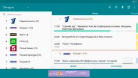 The main menu displays the broadcast plan for the selected TV channels. The name of the programs and the corresponding start time are indicated (Moscow time is used). Clicking on a particular program opens a panel with a brief description. Clicking on a time code activates a reminder - the user will receive a corresponding notification before the start. The catalog can be downloaded only for the current day or for the whole week. It is possible to view the program for a specific date. It is possible to make a selection by certain categories:- entertainment programs;