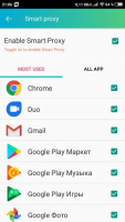 After installation, you need to provide a number of permissions and specify the necessary settings. After that, the start page opens, on which there is a large button with the inscription "Power", to activate the VPN mode it is enough to press it and go to the desired site. By default, the country of the intermediate node is selected automatically (you choose the best option from the list). It is possible to select the country manually - this can be useful if the desired site is available only in a certain location. It is possible to purchase a paid application, in which some additional options appear, including removal of the advertising block. At the top left is an icon to access the main menu. There you can access the Smart Proxy section, help, information about the application, and a link to share with friends.Purpose