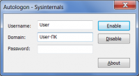 The utility can work in portable mode. It is enough to unpack the archive and run the file that corresponds to the bit capacity of the operating system. A panel will open in which you need to specify a password, PC name and login. To confirm, click the Enable button and wait for the message about saving the parameters. After that, the system will not ask for the password at the initial stage of computer booting, authentication will be performed automatically. The system registry is used to store the data. If the password has been changed, it is necessary to restart applications and enter correct data, otherwise authorization will be denied.Disabling