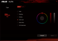 Use the utility and select a color for the backlight. You can customize the "flicker" mode as well as enable "transitions" of the glow. If necessary, you can use a ready-made profile that enables backlighting. In addition, the utility functions allow you to "synchronize" the work of the backlight and parts of the system unit. That's why this program is also called ASUS Aura Sync. The graphical shell of the program is represented by a single panel. There is a multilevel palette and selectors for choosing modes on it. The graphical environment is created in minimalism and without additional controls. Even a beginner can understand the program, because there are no complicated panels in it. ASUS Aura graphic interface doesn't support Russian.Installation