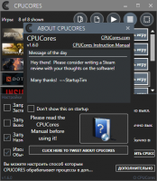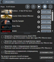 An application that increases the frame rate in games and eliminates microfreezes by improving the interaction with the CPU cores. CPUCores is a solution to maximize the potential of your CPU and get the best performance in computer games. The program directs all the CPU power to the functioning of the game, reducing the importance of other processes and services. In addition, the utility uses its FPS boosting technologies in games that can not work optimally with multi-core processors. The software is distributed only on Steam and independently integrates with projects from this platform. The software is also able to interact with third-party games and, moreover, supports some products that require significant power. However, modern toys are much more demanding to the level of GPU than to the productivity of the CPU. That's why CPUCores are installed first of all not to significantly increase the frame rate, but to remove microfreezes. And hangs can occur, for example, because the running antivirus began to update itself, because of which the load on the CPU is greatly increased. An impressive increase in FPS can be expected only on systems in which the CPU is considered the most "bottleneck". Using the program is very easy. To do this, in its main window click on the "Start Game" button opposite the project you are interested in and wait a few seconds. If you want, you can create