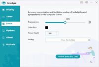 There is a built-in timer, which can be used to plan the alternation of work and rest. At the break stage, you can forcefully lock the screen by adding a screensaver. The right mode also ensures that you work comfortably and stay productive.Focus