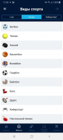 After installing and launching the program, you need to select a sport to continue working. The service pays the most attention to soccer. You can work with championships of different levels - from local to European. There are also less popular areas - snooker, rugby, cybersport and others. It is possible to bet during the match, this functionality is available in the live section. The user can follow the progress of the current competition through the program interface, track events and correct the choice made earlier. The start page of the program contains an updated list of the most popular tournaments at the moment. This allows you to quickly evaluate the current events. All common types of bets are available.Betting